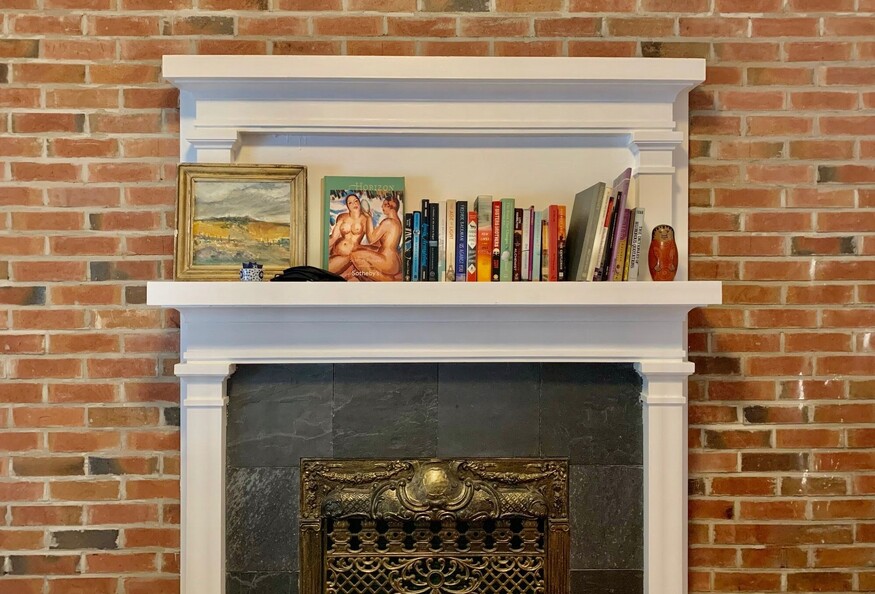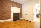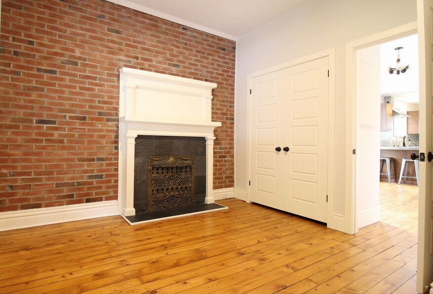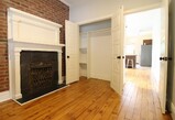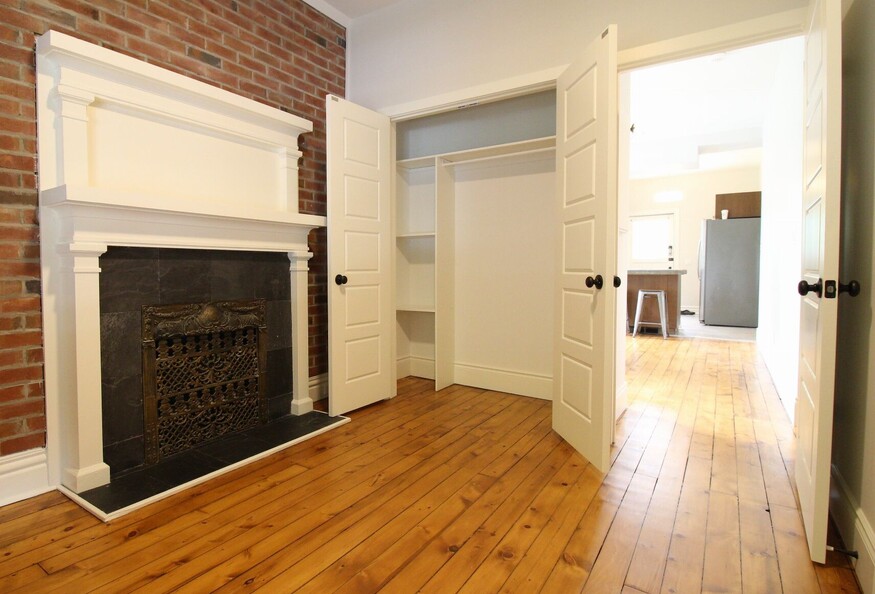 The large master bedroom contains the original fireplace and exposed brick. A massive double door closet with built-in shelving offers plenty storage.