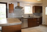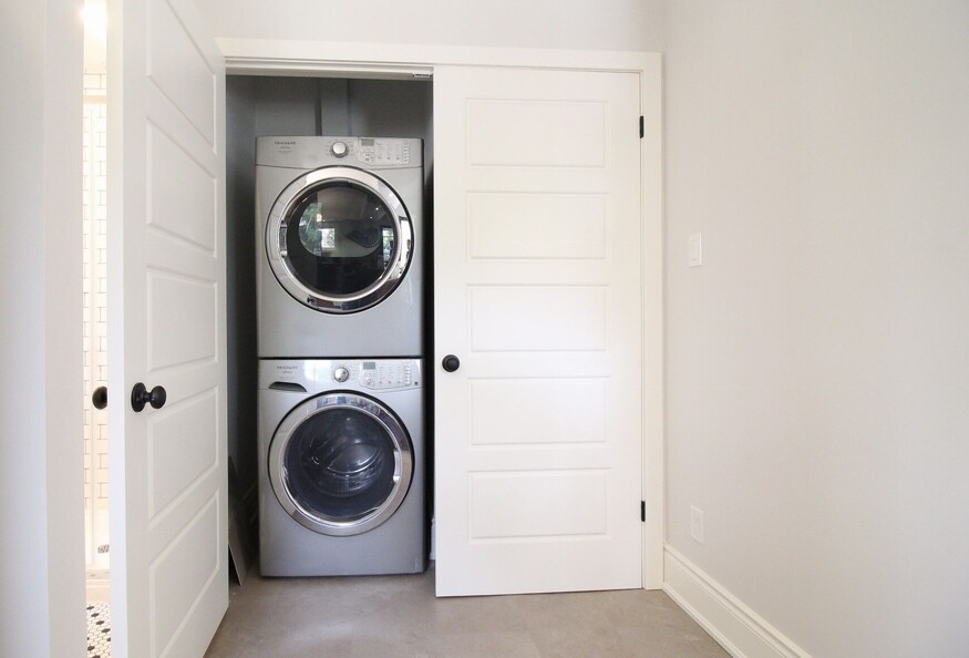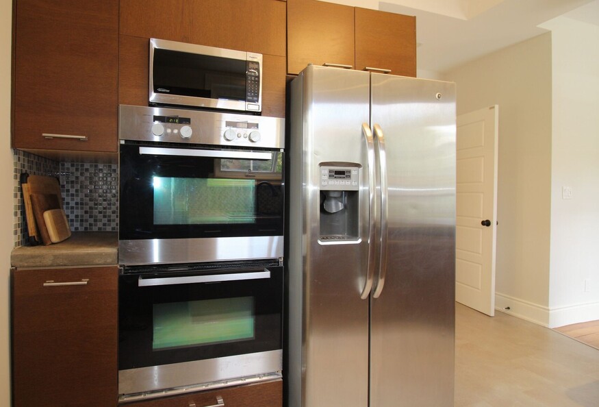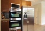 The large kitchen with bar is complete with concrete countertops, a silgranit sink, stainless steel appliances, including a dishwasher, double oven, built in microwave, and fridge with ice/water maker.Adjacent to the kitchen is a full size washer dryer and a large closet for linens.