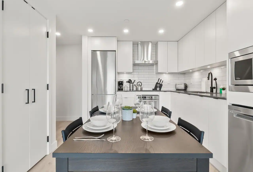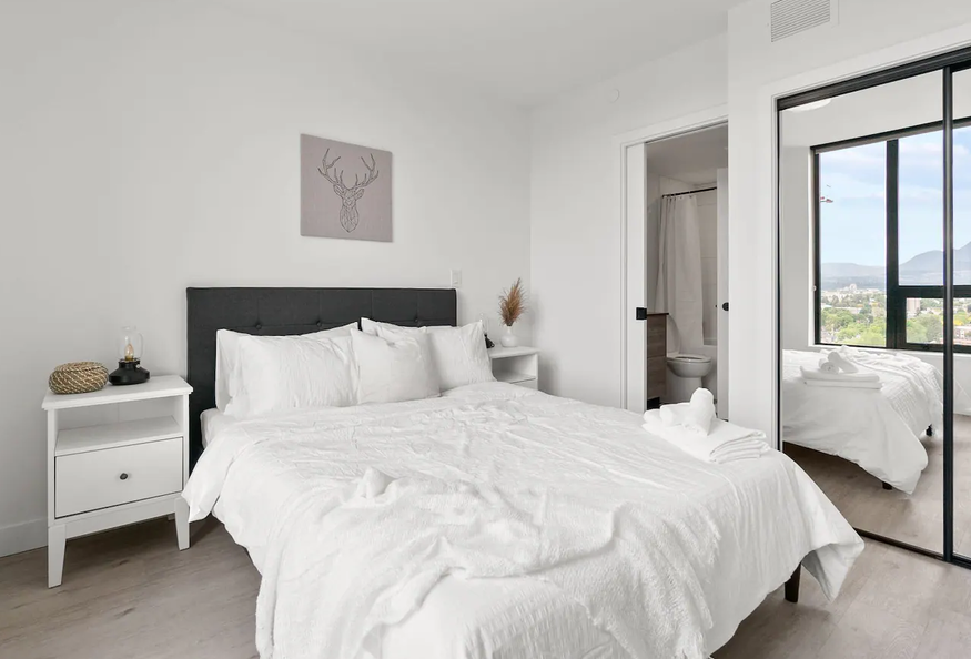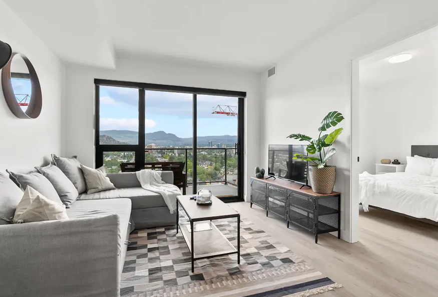 Enjoy this high-end modern condo with secure parking (EV stations available), full kitchen, private balcony, and communal rooftop patio. Utilities and Internet included! This vibrant Okanagan lux property is a quick stroll to the best restaurants, beaches & renowned wineries. Amenities include: Outdoor hiking Comfortable bed Sweeping lake Common area Coffee station Smart tv Central air Full bathroom Few minutes to cultural district, walking distance to beaches, & one hour to Big White Ski Resort We invite you to book this rare find in downtown Kelowna today! The space Located in the heart of Downtown Kelowna, you'll have easy access to all the main attractions the city has to offer! If you'd like to take a stroll along the water, stop by one of the amazing eateries in town, or head out to the wineries, all this is is easily accessible from our amazing central location. Amenities: - 24/7 guest support - Newly furnished - Professionally cleaned - Hotel-quality bed linen and towels - 24/7 check-in Kitchen: - Fully equipped - Kettle & Coffee Maker - Oven - Stove - Refrigerator - Microwave - Tea/Coffee - Dishwasher Open-plan Living/ Dining Room: - Smart TV - Sofa-bed, queen sized - Ample Seating - Full four seater dining table Master Bedroom: - Cozy Queen-sized Bed - Ample Storage Spacious Bathroom: - Shower over tub - Sink - Toilet - Mirror Additional - Washer/Dryer - Communal Outdoor patio - Gated Parking