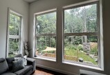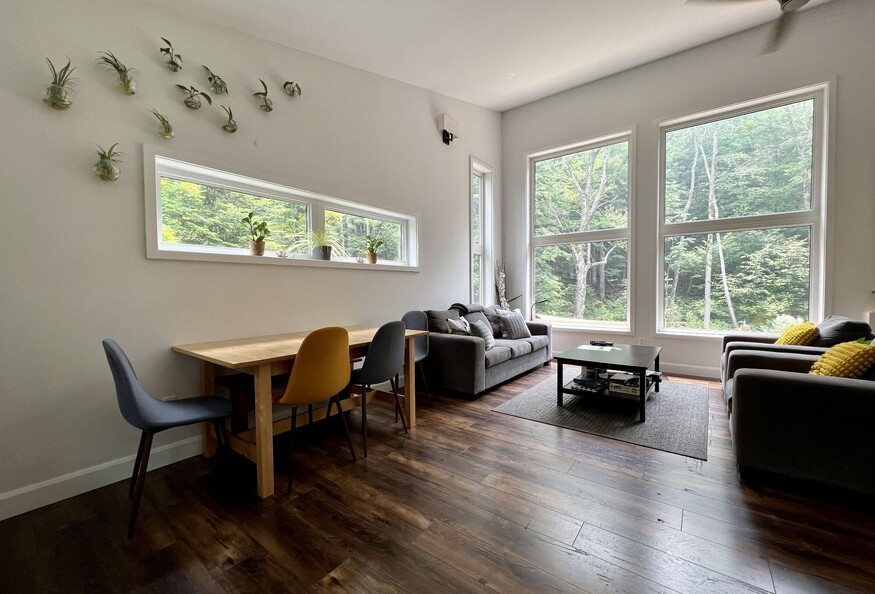 The kitchen is fully stalked and the living room area is open with high ceilings and huge windows looking out at the forest/ski hill.