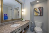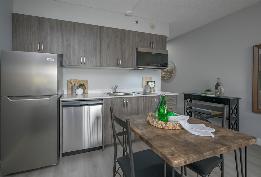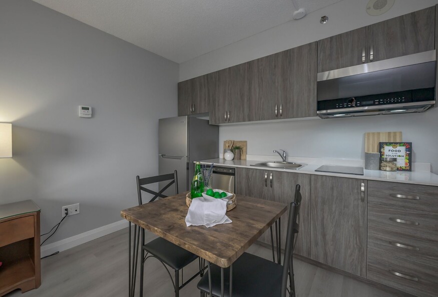 - kitchenette with sink, fridge, dishwasher, 2 burner stove top, microwave and cabinets