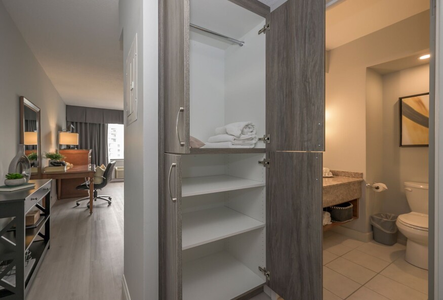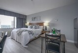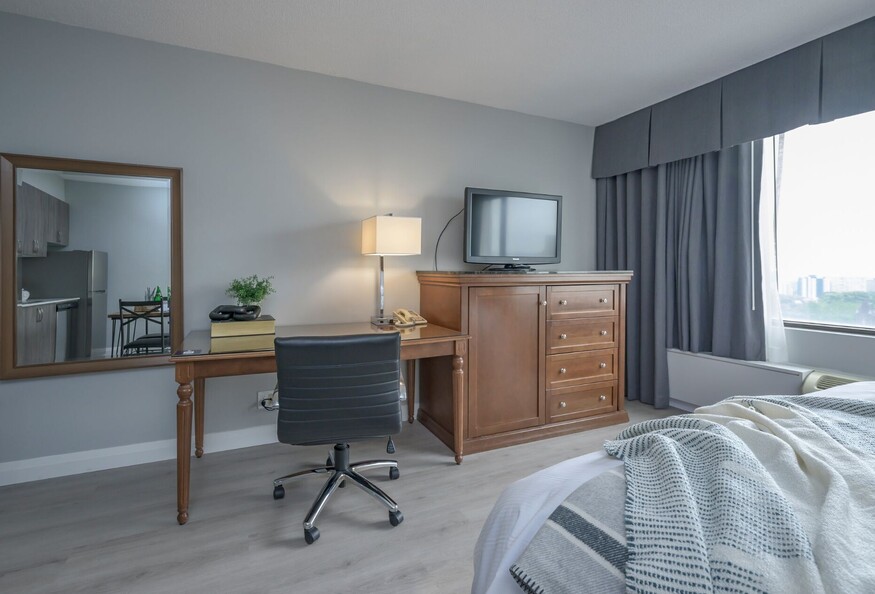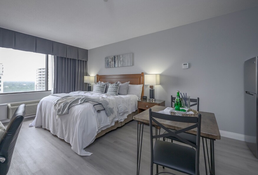 Fully furnished studio apartment with 4 piece bathroom located in downtown London high rise with access to gym, pool, on site cafe and restaurant. 24 hour front desk concierge. Just unpack your clothes and you're moved in!