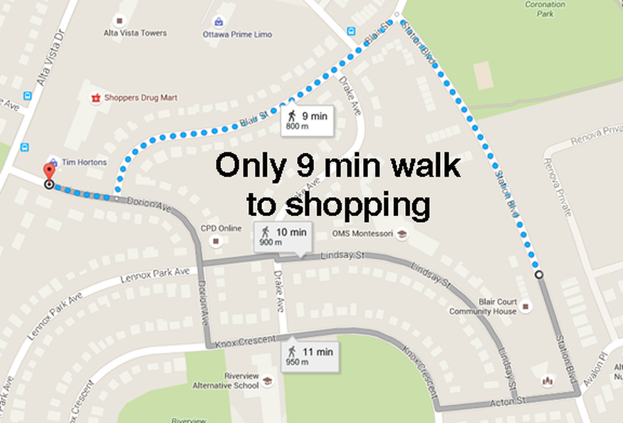- 9 min walk (2 min drive) to Tim Hortons, Shoppers, mini-mart, pizza, cleaner, barber, etc
