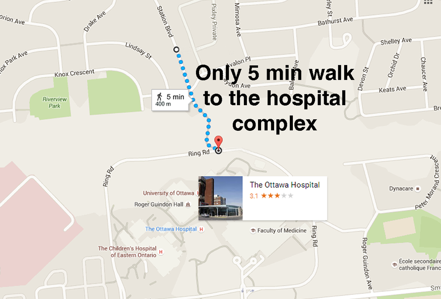 - 5 min walk to Ring Road (leads to CHEO, General Hospital & uOttawa RGN, where you can catch a free uOttawa shuttle to go downtown