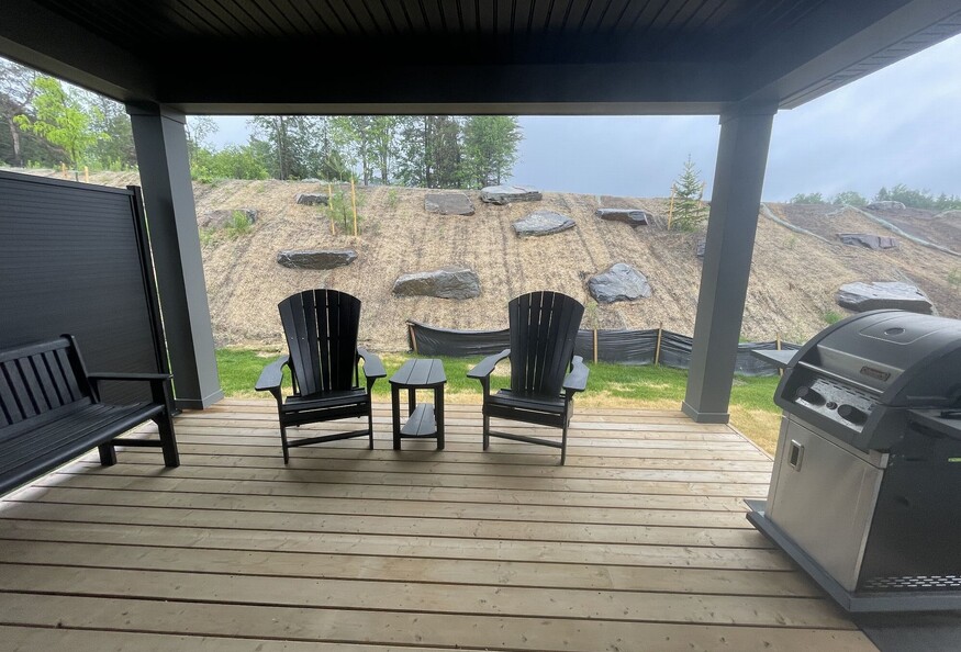 Newly built in 2022. Back Yard green space with deck and room for BBQ Summer and Winter Yard/driveway Maintenance Included in rental price.