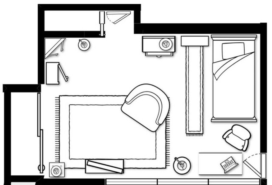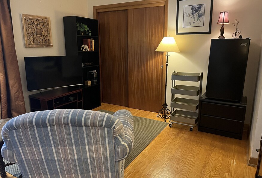 THE BEDROOM is a furnished bed-sitting room and is large. It features a bright, spacious area, eclectic furnishings, a flat-screen television, a mini-fridge, lots of closet space, and a large window. Linens and bedding provided. There is cable TV (Rogers Ignite) and internet/wifi.