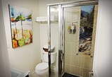 The BATHROOM has a large shower with a built-in glass mural of a local scene, along with a supply of towels and close-up vanity mirror.