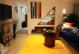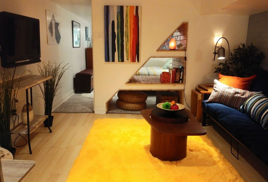 I really like the shelving I designed for under the stairs, that go through from the living room to the bedroom- you can access them on both sides so it's a very functional use of the wide space that separates the rooms. Front garden with sitting area is generally just for you, although sometimes shared with friendly neighbors. Funky + friendly neighbourhood. 24 hour public transport, close to several colleges and universities, lots of cool restos, cafes, antique stores, galleries +++ Everything you need is in walking distance or an easy hop on the TTC.