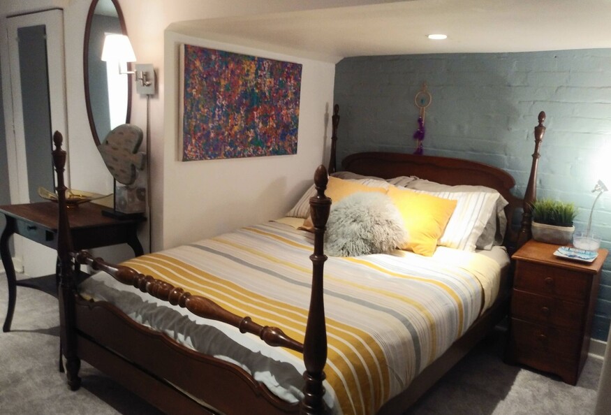 Designer decorated unit in 100 year old townhouse. Everything in pics is yours alone; Full apartment with living room, bedroom, kitchen, bathroom, and two closets. Exposed brick, pot-lights, comfy and cozy. I like a lot of colour, so I've utilised that to express my own style.